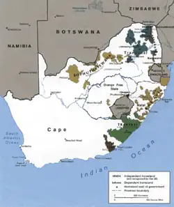 O governo sul-africano tentou dividir o Estado da África do Sul reconhecido internacionalmente em um sem número de republiquetas. Algo como 87% da terra era reservada aos brancos, mestiços, e indianos. Cerca de 13% da terra era divida em dez "pátrias" fragmentadas para os negros (80% da população) aos quais era dada "independência", apesar da autonomia ser mais teórica que real: o exército da África do Sul interviria para remover governos das "pátrias" que implementassem políticas que não fossem do gosto da África do Sul. O governo da África do Sul tentou traçar uma equivalência entre sua visão de "cidadãos" negros nas "pátrias" e a visão da União Europeia e dos Estados Unidos sobre imigrantes ilegais vindos da Europa Oriental e América Latina, respectivamente.