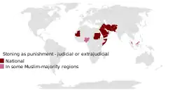 A lapidação é chamada de rajm (Arabic: رجم) na literatura islâmica, e é praticada nos Emirados Árabes Unidos, Irão, Qatar, Mauritânia, Arábia Saudita, Somália, Sudão, Iémen, Nigéria (norte), Afeganistão, e algumas zonas do Paquistão.[15] Em alguns países, como por exemplo o Afeganistão e o Iraque, o apedrejamento foi declarado ilegal pelos Governos, sendo porém praticado extra-judicialmente. Por vezes, a sentença não é levada a cabo, devido ao clamor internacional.