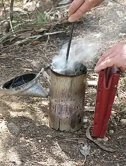 Aplicando fumaça a uma colmeia- Usando uma soprador para remover abelhas nos caixilhos