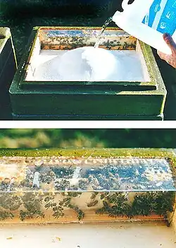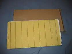 Esta lâmina é fixada dentro dos caixilhos de madeira, onde a abelha constrói favo usando a cera alveolada como num processo chamado de estiramento da cera. A lâmina de cera alveolada é fixada em arames horizontais ou verticais que cruzam o caixilho que é unido a este por um processo de fusão, que é realizada por aquecimento com um sistema de resistência eléctrica ou por passagem de uma corrente eléctrica de baixa tensão (12V) pelos arames, que aumentam a sua temperatura permitindo que a cera incruste e fixe ao longo dos arames. No mercado estão disponíveis lâminas alveoladas feitas de plástico que são recobertos com cera de abelha, embora o uso da lâmina de cera ser predominante pela sua aceitação imediata pelas abelhas e a facilidade para reutilização por fusão quando enegrecida pelo uso. As lâminas de plástico necessitam um processo especial para o reúso quando enegrecidas, para evitar que seja danificado a gravação o inicial dos alvéolos.[25]