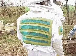A maioria dos apicultores usam alguma roupa de proteção. Apicultores novatos geralmente usam luvas e um roupa fechada, chapéu e um véu com capuz, enquanto apicultores experientes, por vezes, optam por não usar luvas porque inibem manipulações delicadas. O rosto e pescoço são as áreas mais importantes para proteger, por isso a maioria dos apicultores usam, pelo menos, um véu.[21] A abelhas defensivas são atraídas pela respiração, e uma picada na face pode levar a muito mais dor e inchaço do que uma picada em outro lugar, enquanto uma ferroada em uma mão nua geralmente o ferrão pode ser rapidamente removido por raspagem (com a unha) para reduzir a quantidade de veneno injetado. As roupas de proteção são geralmente de cores claras (mas não fortemente coloridas) e de um material suave. Isso proporciona a diferenciação máxima de predadores naturais da colônia (como ursos e gambás) que tendem a ser de cor escura e peludos. As picadas retidas no tecido da roupa continuam liberar um feromônio de alarme que atrai a ação agressiva e mais ataques pungentes. Lavar as roupas regularmente e enxaguar as luvas no vinagre minimiza atração. Para climas quentes as roupas de proteção podem se adicionar aberturas de ventilação em várias áreas do peito e costas protegidas com uma tela ou tecidos duplos.