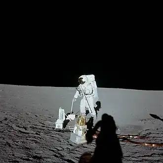 Os experimentos deixados na Lua pela Apollo 12 eram conectados a uma Estação Central, que continha um transmissor, um recebedor, cronômetro, processador de dados e equipamentos para distribuição de energia e controle dos experimentos.[56] O equipamento era energizado pelo SNAP-27, um gerador termoelétrico de radioisótopos desenvolvido pela Comissão de Energia Atômica dos Estados Unidos. Ele continha plutônio e foi a primeira vez que energia atômica foi usada em uma espaçonave tripulada da NASA; alguns satélites militares e da NASA anteriormente tinham usado sistemas similares. O núcleo de plutônio foi levado para a Lua em um invólucro preso a uma das pernas do Módulo Lunar, um contêiner projetado para sobreviver a uma reentrada caso a missão fosse abortada, algo que a NASA considerava improvável.[57] Esse invólucro seria testado na Apollo 13 e sobreviveu a uma reentrada para afundar na Fossa de Tonga no Oceano Pacífico, aparentemente sem vazamento radioativo.[58]