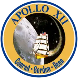 O emblema da Apollo 12 possui uma temática naval para representar o passado da tripulação, pois todos os astronautas na época da missão tinham a patente de comandante da Marinha dos Estados Unidos. Mostra um veleiro clipper chegando na Lua, representando o módulo de comando Yankee Clipper. Há um rastro de fogo atrás e a bandeira dos Estados Unidos está hasteada no mastro. Os nomes dos astronautas e o da missão, este último em algarismos romanos como "Apollo XII", estão grafados em uma faixa dourada que circula o desenho. Há também uma fina borda azul. Dourado e azul são as cores tradicionais da Marinha dos Estados Unidos. Há quatro estrelas no emblema: cada uma para Conrad, Gordon e Bean e a quarta em homenagem a Williams, o Piloto do Módulo Lunar original que teria voado na missão caso não tivesse morrido. Esta quarta estrela foi adicionada por sugestão de Bean.[22]