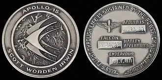 A Apollo 15 usou o módulo de comando e serviço CSM-112, que recebeu o nome de Endeavour em homenagem ao HMS Endeavour, enquanto o módulo lunar LM-10 foi nomeado Falcon em homenagem ao mascote da Academia da Força Aérea. Scott explicou que o nome Endeavour veio do fato de seu capitão, James Cook, ter comandado a primeira viagem marítima puramente científica da história, e a Apollo 15 seria a primeira missão lunar com uma enorme ênfase em ciência.[36] Um pequeno pedaço da madeira do navio de Cook foi levado para o espaço a bordo da nave,[37] enquanto o Falcon levou consigo duas penas de falcão para a superfície em reconhecimento ao serviço da tripulação na Força Aérea.[38][39]