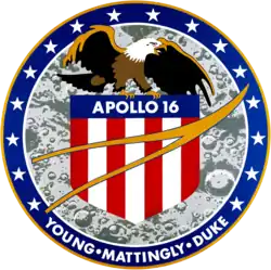 O emblema da Apollo 16 é circular e possuí uma águia-americana pousada sobre um escudo vermelho, branco e azul, representando o povo dos Estados Unidos. Atrás está um fundo cinza representando a superfície lunar. Acima do escudo está o vetor dourado da NASA. Ao redor está uma faixa azul com borda dourada, dentro da qual já dezesseis estrelas, representando o número da missão, e o nome dos três astronautas embaixo.[21] O emblema foi criado a partir de ideias concebidas pelos três astronautas,[22] com a versão final tendo sido desenhada por Barbara Matelski da equipe gráfica do Centro de Espaçonaves Tripuladas em Houston.[23]