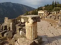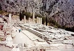 O santuário délfico mais recente, quando já era presidido por Apolo, foi construído no fim do século VI a.C., em uma série de terraços interligados por uma Via Sacra, que era usada como caminho de procissões, culminando no terraço do templo propriamente dito, uma estrutura dórica erguida a mando de Clístenes, que foi destruída por uma avalanche no século IV a.C.. Foi então reconstruído no mesmo local uma estrutura idêntica à anterior, financiado por toda a Grécia. Ao longo da Via Sacra foram com o tempo erguidas várias capelas, chamadas de tesouros, por cada cidade grega, e serviam como depósitos das oferendas para Apolo. Algumas eram ricamente ornamentadas, como os tesouros de Sifno e de Atenas. Também foi erguido um muro em torno de toda a área, além de oratórios menores, um estádio, um teatro, casas para os sacerdotes e para as pitonisas, memoriais e outras estruturas.[109]