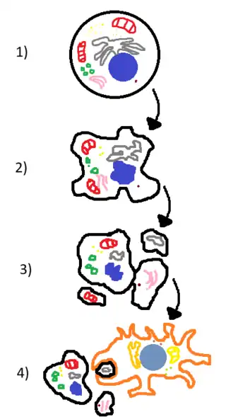 - Formam-se bolhas de citoplasma partindo da membrana plasmática celular, que se desprendem e formam corpos apoptóticos. Eles serão, então, reconhecidos e fagocitados por macrófagos. Alguns destes corpos apoptóticos podem conter fragmentos de material genético.[10]