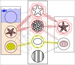 Execução subsequente da rede em uma imagem de entrada (esquerda):[142] A rede detecta corretamente a estrela-do-mar. No entanto, a associação fracamente ponderada entre textura anelada e ouriço-do-mar também confere um sinal fraco a este último de um dos dois nós intermediários. Além disso, uma concha que não foi incluída no treinamento fornece um sinal fraco para a forma oval, resultando também em um sinal fraco para a saída do ouriço-do-mar. Esses sinais fracos podem resultar em um resultado falso positivo para o ouriço-do-mar.