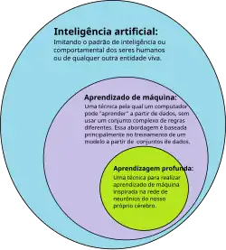 No aprendizado de máquina, a aprendizagem profunda se concentra na utilização de redes neurais multicamadas para executar tarefas como classificação, regressão e aprendizagem de representação. O campo se inspira na neurociência biológica e é centrado em empilhar neurônios artificiais em camadas e "treiná-los" para processar dados. O adjetivo "profunda" se refere ao uso de múltiplas camadas (variando de três a várias centenas ou milhares) na rede. Os métodos usados podem ser supervisionados, semissupervisionados ou não serem supervisionados.[1]