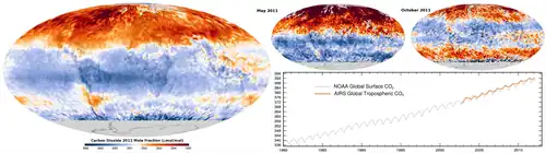 - A composição isotópica do gás carbônico atmosférico (CO2) indica que tem principalmente origem fóssil, derivando da combustão do petróleo, do gás natural e do carvão mineral, combustíveis fósseis de uso generalizado na sociedade moderna. A quantidade de O2 também tem diminuído de forma consistente com a liberação de CO2 por meio de combustão.[19][44] Nos últimos 800 mil anos a concentração de CO2 atmosférico manteve-se relativamente estável, variando de 170 a 300 ppm (partes por milhão). Contudo, desde a Revolução Industrial, iniciada em meados do século XVIII, a concentração atmosférica aumentou aproximadamente 35%,[19] ultrapassando as 410 ppm em 2011,[12] resultado da emissão de cerca de 375 bilhões de toneladas de gás desde 1750 até 2011 somente nas áreas de combustíveis fósseis e produção de cimento. (Um bilhão de toneladas equivale a 1 gigatonelada). De 100 a 260 bilhões de toneladas a mais foram emitidas no mesmo período por mudanças no uso da terra, principalmente o desmatamento nas regiões tropicais. Menores quantidades tiveram origem em outras fontes. Do total, cerca de 240 bilhões se acumularam na atmosfera, e o restante foi absorvido pelos oceanos, pelos solos e pela biomassa.[14] Nas últimas décadas, cerca de 80% desse aumento deriva da queima de combustíveis fósseis, e cerca de 20% advém do desmatamento e de mudanças nas práticas agrícolas.[19] Os níveis de emissão têm crescido quase continuamente, chegando nos últimos anos à ordem de dezenas de gigatoneladas por ano.[45] Em 2012, foram emitidas 31,6 gigatoneladas,[46] e somente nas áreas de combustíveis fósseis e indústria foram 35,9 gigatoneladas em 2014 e 35,7 gigatoneladas em 2015.[47] Dados da FAO mostram que o desperdício de alimentos é a terceira maior causa de emissões de carbono, respondendo pelo lançamento anual de 3,3 bilhões de toneladas de CO2 e outros gases estufa na atmosfera.[33]