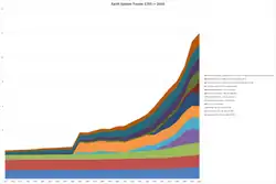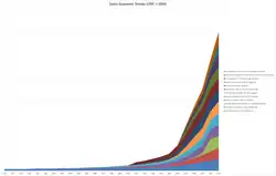 Gráficos ilustrando a evolução de vários indicadores socioeconômicos (esquerda) e indicadores de impacto ambiental (direita) no período de 1750 a 2010. Destaca-se o período a partir da década de 1950, que enfoca a chamada Grande Aceleração do Antropoceno, quando o impacto das atividades humanas sobre a face do planeta se tornou exponencial[24] | ||