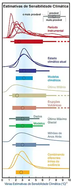 O primeiro estudo desse tipo data de 1896, feito pelo sueco Svante Arrhenius.[60] Daí em diante, inúmeros outros foram feitos, a partir de diversos conjuntos de dados e abordagens metodológicas, em países e épocas diferentes. Neles incluem-se tanto levantamentos empíricos, realizados a partir de dados paleoclimáticos ou medições instrumentais recentes, quanto cálculos teóricos baseados em simulações de computador – os modelos climáticos.[81] O 5º Relatório do IPCC indica uma sensibilidade climática entre 1,5 e 4,5 °C, se a concentração de CO2 subir para o dobro dos níveis pré-industriais, isto é, de 280 ppm para 560 ppm. Uma elevação acima de 4 °C foi considerada improvável em quase todos os modelos do IPCC. Uma elevação maior que 6 °C não foi excluída mas é muito improvável, e valores abaixo de 1 °C são extremamente improváveis, dentro dos parâmetros de emissão mencionados. Vide nota[82] Nenhum dos cenários matemáticos é otimista quanto à perspectiva de conseguirmos manter o aquecimento em torno de 2 °C — isso se as metas oficiais de emissão forem cumpridas —, e nenhum deu a esta possibilidade uma chance maior do que 50%.[14] O pessimismo é justificado: Em 2011 a concentração do CO2 atmosférico ultrapassou as 410 ppm[12] e continua em ascensão ininterrupta, com novos recordes sendo quebrados continuamente. Projeções conservadoras apontam para mais de 700 ppm até 2100, mas a evolução das emissões, mantidas como vêm se mostrando até aqui, sugere mais de 1 000 ppm até o final do século.[83]