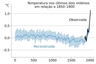 É inequívoco que a temperatura média da Terra tem se elevado desde meados do século XVII, e é inequívoco que as atividades humanas têm sido o fator determinante nesse processo. No período de 1850–2021 a temperatura global, combinando os registros dos oceanos e dos continentes, aumentou em média 1,09 °C. Os continentes estão aquecendo mais rápido do que os oceanos. Nos continentes a média de aumento foi de 1,59 °C e nos oceanos de 0,88 °C.[12] Apesar de o oceano absorver mais calor do que as massas continentais, responde com mais lentidão, e desde 1979 as temperaturas em terra aumentaram quase duas vezes mais rápido que as temperaturas no oceano (0,25 °C por década contra 0,13 °C por década).[13] A elevação na temperatura não foi, porém, linear, com várias oscilações para mais e para menos. Variações desse tipo são naturais e esperadas, mas a tendência geral é claramente ascendente.[14]