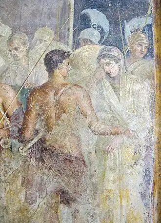 ![]() Pintura policromática grega antiga em cerâmica (datada de c. 300 a.C.) de Aquiles durante a Guerra de Troia | |