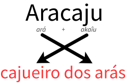 Segundo Eduardo Navarro, em seu Dicionário de Tupi Antigo (2013), o topônimo "Aracaju" pode ter origem no termo tupi arákaîu, que significa "cajueiro dos arás" (ará, gênero de aves + akaîu, cajueiro, formando uma relação genitiva) traduzido diretamente do tupi é cajueiro (ou cajueiros, no plural) dos arás.[11][12] Theodoro Sampaio, em seu Tupi na Geografia Nacional, dá uma etimologia semelhante: cajueiro dos papagaios.