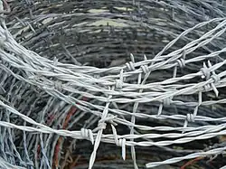 - ↑ sionally corrupted as bobbed wire«A Collection of Barbed Wire». The Murray County Museum. Consultado em 28 de novembro de 2006. Cópia arquivada em 14 de julho de 2011 or bob wire,Timothy Foote (6 de setembro de 1999). «The Rape of the West». The New York Times. Consultado em 28 de novembro de 2006.