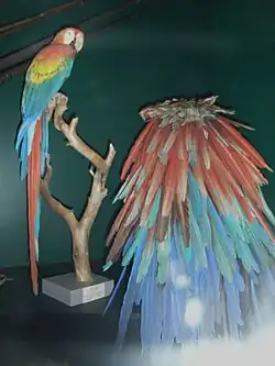 Ainda hoje está presente nas culturas indígenas que sobreviveram.[4] Como exemplo, os Yanomami, nos ritos ligados à entidade mítica Wasulumani, representada pela Ara macao, evitam o uso de penas multicores para não ofendê-la, competindo com seu esplendor, e seus adornos se limitam a penas de cores preta e branca.[35] Além disso, sua imagem aparece nas obras de vários artistas antigos e contemporâneos de todo o mundo, seja em pintura, gravura, fotografia e outras técnicas, incluindo estamparia de tecidos.[36][37][38][39][40][41][42][43] Sua imagem também já foi impressa em selos.[44][45]