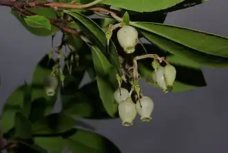 As inflorescências apresentam-se em panículas pendentes, com ráquis avermelhado e brácteas ovado-lanceoladas em forma de cúpula envolventes, avermelhadas. O cálice tem 1-1,5 mm de comprimento, mais ou menos persistente, com lóbulos curtos, triangulares, soldados na base. A corola é urceolada, com 7–8 mm de comprimento, branca, amarelada, caduca quando dessecada, com 5 dentes revolutos finamente ciliados. Os estames são inclusos, em número de 10, com filamentos pilosos, muito dilatados na base, e as anteras são apendiculadas, avermelhadas, com deiscência foraminal. O ovário é tuberoso, glabro, com estilo com nervuras direitas e um tanto cónico, também incluso.[3]