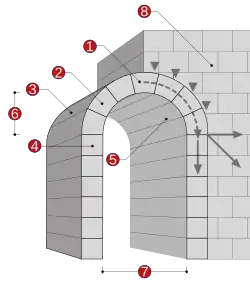 Geralmente em pedra, tijolo ou outro material de construção similar, o arco é composto por blocos em cunha que, colocados adjacentemente, se travam uns aos outros em compressão e mantêm a forma em curva.