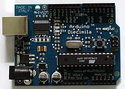 | Arduino Diecimila[44] | Interface USB. Reiniciado pelo computador. Usa regulador de tensão de baixa queda que reduz a tensão de entrada quando alimentado por uma fonte externa. | Atmega168 em um pacote DIL28 (foto) | Pinos com PWM: 3; Digitais: 14; De I/O: 20; Analógicos: 6 | 16 MHz | Flash:16KB; RAM:1K SRAM; ROM: 512 Bytes EEPROM |