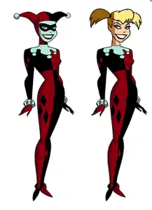 ![]() Arlequina como ela aparece na Batman: A Série Animada, sua caracterização foi inspirada no bobo da corte e no arlequim | |