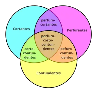 - 5. Cortocontundentes: são as peças que atuam cortando, mas que por conta também de sua massa, acabam igualmente exercendo um efeito contundente ou esmagador sobre os tecidos atingidos. A guilhotina, o machado, o cutelo e a foice são bons exemplos para ilustrar a definição.