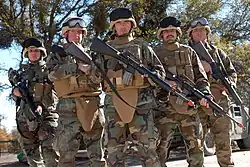 Colete a prova de balas Armadura (esquerda) usada para proteção durante instrução de defesa pessoal da marinha dos Estados Unidos. Militares dos Estados Unidos usando capacetes leves e coletes táticos modulares equipados com proteção de pescoço e virilha. Integrante da tropa de choque da Polícia Nacional do Panamá em traje de proteção completo.