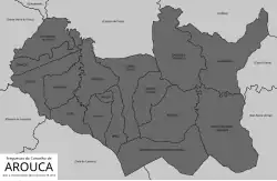 Apesar de estar integrado no distrito de Aveiro (na parte do seu extremo nordeste que faz fronteira com o distrito do Porto), a identidade estrutural autóctone do município de Arouca (em termos físicos, orográficos, geológicos, naturais, étnicos, arquitetónicos, gastronómicos[9] [10] [11] [12] e linguísticos) possui a identidade autóctone dos municípios do distrito do Porto (território estrutural do Douro Litoral[13]). O município situa-se em plena bacia hidrográfica do rio Douro (para onde se direciona o rio Arda a partir do vale de Arouca, que desagua no rio Douro[14]), bem como o rio Paiva[15] (que percorre uma parte da zona nordeste do município de Arouca e desagua no rio Douro), onde estão localizados os Passadiços do Paiva,[16] a uma hora de distância do Porto, que permitem, por momentos, sair da realidade do espaço urbano do Porto[17] e entrar num cenário saído de um filme.[18] No rio Douro, também desagua o rio Inha, na freguesia de Lomba (Gondomar),[19] que percorre a zona ocidental do município de Arouca, bem como o rio Sardoura, que nasce na fronteira norte da freguesia de Santa Eulália (Arouca).[20] Neste território arouquense, em plena bacia hidrográfica do Rio Douro, são de considerar afluentes de relevância como o rio Paivó e o rio Ardena, afluentes do rio Paiva, bem como o rio Urtigosa, afluente do Rio Arda (Portugal). O espaço urbano principal de referência dos arouquenses (capital da sua área metropolitana, do Douro Litoral, do Entre Douro e Minho e da Região do Norte) sempre foi a cidade do Porto, que dista, por estrada, cerca de 55 km da vila de Arouca e cerca de 35 km das fronteiras oeste e noroeste do município de Arouca e para onde (desde que foram criados) sempre existiram transportes públicos diários[21] a partir da vila de Arouca.[22]