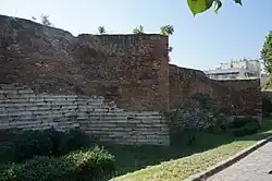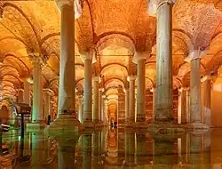 Do mesmo período datam os edifícios não destinados ao culto do Grande Palácio de Constantinopla, hoje em ruínas[30] bem como a Muralha de Teodósio (provavelmente iniciada sob Teodósio II), que, com os seus vinte quilómetros de comprimento e as suas imponentes torres, é um dos principais atrativos turísticos da cidade, além de ter permitido que ela resistisse a todos os seus inimigos por mais de mil anos. Mencionemos também o “Palácio Submerso” (em turco, Yerebatan Sarayī). Iniciado sob o governo justiniano na década de 530, este edifício que servia a múltiplos propósitos abrigava uma cisterna subterrânea de 138m por 65m decorada com 28 fileiras de 12 colunas cada uma sustentando uma abóbada de tijolos.[31] Além do “Aqueduto Justiniano”, ainda se pode admirar a ponte monumental que permite atravessar o Sangário (hoje Sacaria) datada do século VI bem como a ponte sobre o Karamagara no leste da Turquia. Datada do século V ou VI, é uma ponte em arco de arco único de 17 metros de comprimento e de 10 metros em altura.[32]