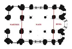 À esquerda da vima, na parte norte do altar, localizava-se o prótesis, onde se realiza a proscômide e se guardam os vasos sagrados. No lado sul ficava o diacónico, onde se guardavam os paramentos litúrgicos e os Evangelhos. Conjuntamente, o prótesis e o diacónico eram chamados de pastofório. A barreira que os separava do resto do templo (Templon), desde o seu aparecimento nas primeiras basílicas, sofreu uma evolução significativa. Aproximadamente a partir do século XIV, passou a ser feita de madeira e adquiriu a função de iconostase.[102][103] Esta organização do espaço refletia as mudanças na liturgia, que após o século VI se tornou mais fechada e centralizada.[104] Da parte ocidental do templo desapareceu o átrio característico das basílicas primitivas, onde os fiéis se reuniam. O papel do átrio, juntamente com a função de realizar serviços de batismo e memoriais, passou para o Nártex. Entre o nártex e o santuário encontrava-se o espaço principal do templo, agora chamado naos. Ao contrário das naves alongadas primitivas, o naos era geralmente quadrada em planta, mas continuava dividido por colunas. Sobre o naos erguia-se a cúpula, definindo o eixo vertical do templo. Uma vez que a participação dos leigos na liturgia diminuiu, desapareceram os corredores destinados às procissões, a soleia e o ambão. Um exemplo clássico desta arquitetura é a igreja de Mireleu e, segundo a opinião predominante, a Nea Ekklesia de Basílio, o Macedónio, teve uma importância decisiva para o desenvolvimento posterior da arquitetura bizantina.[10] Pensa-se que a variante amplamente difundida com um núcleo de cinco cúpulas segundo o esquema de quincôncio remonta a este templo perdido.[105][106]