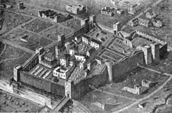 Simultaneamente, ocorria uma cristianização geral da face das cidades, contudo, sabe-se muito menos sobre a arquitetura civil protobizantina do que sobre a eclesiástica, devido à sua insuficiente preservação.[67][68] Das edificações de Constantinopla do século IV, praticamente nada restou, mas a primeira igreja dos Apóstolos tornou-se um modelo para templos construídos nas décadas seguintes em Milão, Ravena, Éfeso, Antioquia e outras cidades do império. Foi então que a estrutura do conjunto palaciano começou a tomar forma e as primeiras muralhas da cidade foram erguidas.[69] O protótipo dos martírios da Palestina bizantina foi a rotunda do Anastasis, uma das partes da Basílica do Santo Sepulcro em Jerusalém. Tais estruturas cêntricas, circulares ou poligonais em planta e com colunatas, foram erguidas na Terra Santa até ao final do século V.[70]