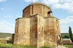 Nos templos provinciais[n] o nártex podia estar ausente, e o pastofório podia reduzir-se a um nicho na vima. O volume geral do templo é construído de forma piramidal, com as abóbadas a descerem em cascata a partir da cúpula central. Regra geral, a cúpula apoia-se num tambor e é rodeada por um anel de janelas, permitindo que a luz do dia penetre profundamente no templo. Os quatro apoios da cúpula situam-se nos cantos de um quadrado, dividindo o espaço do naos em nove compartimentos.[108] Na periferia do império, o desenvolvimento da arquitetura seguiu a mesma direção das regiões sob influência cultural direta de Constantinopla. Na Arménia bizantina e na Ibéria, a partir do século VII, foi construído um grande número de basílicas cupuladas e igrejas de cruz inscrita.[109] A partir do século VII, os arquitetos arménios utilizaram trompas para sustentar as cúpulas.[110] Nestas, observa-se uma tendência para alongar todo o edifício, especialmente os tambores das cúpulas, para cima; as coberturas cónicas dos tambores tornaram-se pontiagudas. As paredes e tambores eram cobertos por finas arcaturas sobre colunas longas, emoldurando janelas e nichos.[10] A Catedral de Mren, construída antes de 640, possui dimensões consideráveis (26,5 × 45,5 metros em planta), e a sua cúpula sobre um tambor elevado atinge os 25 metros. Outros templos do mesmo período têm plantas semelhantes, como a Igreja de Santa Gaiané em Valarsapate e a Igreja de Tsromi na Geórgia. A sua fachada oriental é dividida por dois recessos significativos, o que é um traço característico da arquitetura religiosa arménia e georgiana.[111] A Catedral de Ani (final do século X) distinguia-se por um tratamento interno complexo, lembrando as catedrais góticas da Europa Ocidental.[10]