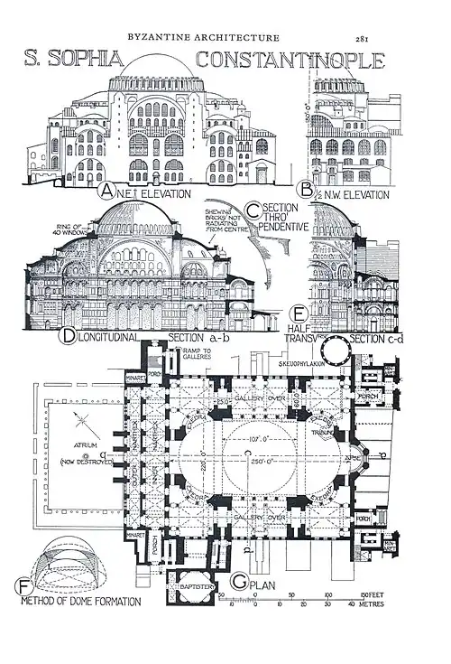 A planta da Basílica de Santa Sofia, construída em Constantinopla entre 532 e 537, é o monumento mais representativo. Uma imensa cúpula de 31 metros de diâmetro por 54 de altura repousa sobre quatro pilares gigantescos.[26] No tambor, quarenta janelas criam uma atmosfera celestial. A planta de Santa Sofia é uma síntese original de dois tipos de plantas: a planta central em forma de quadrado coroado por uma cúpula e rodeada por absides e absidíolos, e a planta longitudinal (basílica) que permite o prolongamento da nave central longitudinal, ladeada por naves laterais. Apesar da sua complexidade, resultou numa solução de grande unidade e harmonia, fazendo desta basílica uma das obras-primas mais admiradas da história da arquitetura. Embora a igreja seja dominada pela sua enorme cúpula central, a sua planta mantém a de uma basílica com nave central e corredores laterais[b] separados por duas colunatas que margeiam a nave, mas as fileiras de colunas tradicionais são modificadas pela inserção de quatro grandes pilares que servem de suporte aos pendentes que sustentam a cúpula. A planta quadrada da parte central da nave é ocupada em comprimento por duas enormes absides da mesma largura que o quadrado central da nave (32 metros). A planta semicircular dessas absides é ampliada por dois absidíolos menores nas suas laterais. Estes absidíolos são sustentados cada um no seu centro por duas colunas em vermelho pórfiro (mais visível) que os separam dos corredores laterais e assim continuam as colunatas que margeiam a nave para além dos grandes pilares. Os grandes pilares são ainda decorados com falsas colunas em pórfiro ou mármore verde dependendo das laterais. Todos estes artifícios têm o efeito de obter uma espécie de nave grande com o dobro da largura e de libertar na igreja um gigantesco volume interior desprovido de qualquer estrutura, até então inigualável, coberto pela grande cúpula ao centro e ladeado por várias meias-cúpulas. Além disso, a técnica dos pendentes, apoiados em pilares, inutiliza as paredes laterais altas (não portantes) o que permitiu inserir as colunatas laterais em dois níveis (incluindo um piso para as arquibancadas) e abrir as paredes acima das arquibancadas para iluminar majestosamente o interior através de uma infinidade de janelas em dois níveis adicionais, às quais se acrescenta a coroa de quarenta janelas que os arquitetos conseguiram criar na própria cúpula. A igreja é, portanto, tão luminosa quanto as primeiras basílicas cristãs, que suportam apenas molduras de madeira; o efeito é impressionante. Os interiores eram trabalhados com lavores rendilhados com folhas de acanto e capitéis em pirâmide invertida — criação bizantina para receber o peso dos arcos. Os altares possuíam pedrarias em profusão e placas de ouro, acompanhado por móveis de marfim e candelabros de ouro. Em contraste com o interior luxuoso, o exterior é normalmente muito simples.