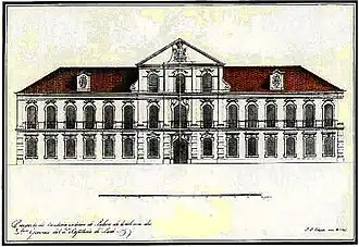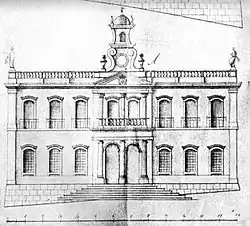 Fachada principal do Palácio dos Governadores Gerais do Grão-Pará em Belém (construído 1768-72). A fachada e frontão são neoclássicos, mas as janelas e portais tem perfil barroco pombalino. Desenho de J. Codina (1784).