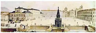 Vista do Largo do Paço do Rio de Janeiro (Jean Baptiste Debret, c. 1830). O Paço Imperial é o edifício do lado esquerdo do largo. No centro, em primeiro plano, está o Chafariz de Mestre Valentim.