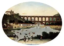 Tela de Leandro Joaquim (c. 1790) que mostra o Aqueduto da Carioca do Rio de Janeiro. Vê-se também o Convento de Santa Teresa, implantado cenograficamente sobre o morro. A lagoa em primeiro plano foi aterrada para a construção do Passeio Público.