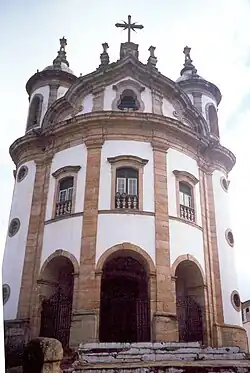 Igreja de Nossa Senhora do Rosário dos Pretos de Ouro Preto (começada em 1757), com superfícies curvas da fachada e torres.