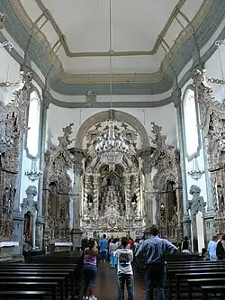 Os interiores das igrejas coloniais devem ser vistos não só em termos arquitetônicos mas também decorativos, pois os ambientes internos eram muitas vezes definidos pela harmoniosa interação entre talha dourada, pintura e azulejaria, típica da arte portuguesa.[30]