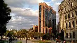 A chamada "arquitetura pós moderna" brasileira[2] se reflete em grande parte na adoção dos elementos formais mais óbvios da manifestação norte-americana do "movimento". No Rio de Janeiro seu exemplo mais conhecido talvez seja o edifício Rio Branco 1, projeto de Edison Musa, que repete o uso do frontão - que se tornou uma marca de Philip Johnson - e subdivide o edifício em base, corpo e coroamento (como na divisão clássica). Igualmente, o arquiteto mineiro Éolo Maia adota como estilo alguns elementos da arquitetura do americano Michael Graves entre outros (Maia utilizou um largo repertório de referências em sua arquitetura).[3]
