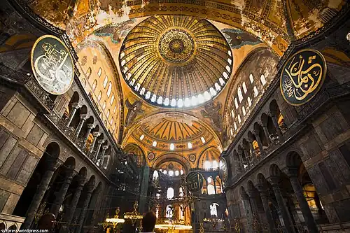 A cúpula da igreja proporcionava um grande baldaquino dourado e preenchido por luz, bem acima do espaço processional para os muitos sacerdotes e membros da corte imperial, que ali se reuniam para celebrar a Eucaristia. A atenção dos fiéis durante a missa centrava-se nos mosaicos que se estendiam até ao topo da cúpula, e não no altar e na abside. O foco da atenção dos fiéis para cima reflete o interesse dos filósofos bizantinos pelas teorias neoplatónicas, que viam a meditação como uma forma de sair do mundo material para um estado espiritual. Os fiéis que se encontravam no chão da igreja certamente sentiram tal elevação espiritual enquanto contemplavam os mosaicos de santos, anjos e a cúpula dourada central, que personificava o próprio paraíso.[14] Grandes superfícies de mosaicos dourados brilhantes que outrora cobriam as paredes, abóbadas e cúpulas foram em grande parte perdidas ou cobertas por reboco colorido do século XIX.[13] Alguns dos mosaicos foram redescobertos durante a segunda metade do século XX e estão visíveis ao público, após Santa Sofia se ter tornado um museu.[16] O historiador da corte de Justiniano, Procópio de Cesareia, nas suas descrições do rico interior de Santa Sofia logo após a conclusão da sua construção, afirmou: Citação: E quanto aos tesouros desta igreja, é impossível dar o valor exato de todos os vasos de ouro e prata e pedras preciosas que o imperador Justiniano aqui dedicou. Permitirei que os meus leitores tentem estimar o valor deste tesouro por si mesmos através de apenas um exemplo. A parte da igreja que é especialmente sagrada e acessível apenas aos sacerdotes (o santuário), nela encontram-se mais de 18 toneladas de prata.[13]