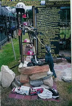 Duas imagens da Aldeia Africana de Joe Minter na América, um ambiente artístico visionário de meio acre em Birmingham, Alabama. As cenas incluem guerreiros africanos assistindo às lutas de seus descendentes no Alabama, homenagens a cientistas negros e líderes militares, recriações dos épicos confrontos pelos direitos civis no Alabama e cenas bíblicas.