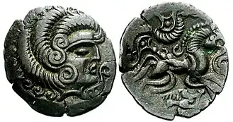 Por volta do século III a.C., os celtas começaram a produzir moedas, imitando motivos gregos e romanos posteriores, a princípio bastante próximos, mas gradualmente permitindo que seu próprio gosto se assumisse, de modo que versões baseadas em cabeças clássicas sóbrias abrem espaço para retratos das mais variadas formas.[72][73][74]
