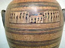 A produção de vasos decorados foi uma das poucas manifestações artísticas que não sofreram interrupção na Idade das Trevas grega, havendo pois uma tradição contínua que remonta a tempos imemoriais. Interessa-nos, porém, a produção a partir do período geométrico. Nesta fase a decoração é bastante elementar, resumida a linhas e padrões geométricos abstratos - de onde vem o nome do período - distinguindo-se da preferência por padrões derivados do círculo da fase anterior. Embora aparentemente simples, era uma arte sofisticada, obedecendo a uma série de convenções precisas, e alguns de seus exemplos se contam entre as melhores criações da arte grega de todos os tempos. Figuras começaram a aparecer em torno de 850 a.C., com faixas de animais e pessoas de perfil simplificado, acompanhando a diversificação dos padrões abstratos. Na fase final começaram a surgir cenas mitológicas.[73][74][75]