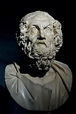 A tradição literária grega iniciou com Homero, cuja historicidade é motivo de conjetura, mas é considerado muitas vezes o pai da literatura ocidental. Seus dois grandes poemas épicos, a Ilíada e a Odisseia, criaram uma tradição viva até hoje, com inúmeros desenvolvimentos derivativos. Eles coletam tradições antigas respectivamente sobre a Guerra de Troia e a viagem de Odisseu de volta para casa, e embora se apresentem como poemas históricos, grande parte da sua atenção é devotada à descrição de episódios fantásticos ou lendários e às intervenções dos deuses na vida humana. Por outro lado, traçam um vasto panorama da sociedade grega do período histórico imediatamente anterior, especialmente retratando a classe aristocrata, com seus costumes, suas crenças, suas motivações, seu perfil psicológico, suas relações com os estrangeiros e sua organização social. Da mesma época são alguns hinos atribuídos a Homero sem qualquer certeza, embora exibam um estilo similar.[87][88]