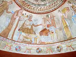 Durante o helenismo a pintura grega se internacionalizou ainda mais, sendo levada por Alexandre até a Ásia e o norte da África, e desta fase os exemplos originais são um pouco mais numerosos, sendo especialmente importantes os da Tumba do Soldado em Alexandria,[68] e variados fragmentos em tumbas, palácios e residências de Demétrias, Sidom, Atenas, Cnido, Pela, Delos e Pérgamo, entre outras cidades.[50] Um grande exemplo mural está no Túmulo Trácio de Kazanlak, hoje um Patrimônio Mundial.[69] No helenismo o ilusionismo tridimensional permaneceu como o principal interesse na pintura, mas os temas populares se tornaram largamente apreciados, entre eles a natureza-morta, a paisagem e as cenas domésticas, que se encontravam até em miniaturas. Ao mesmo tempo, os produtores de mosaicos começavam a imitar efeitos tipicamente pictóricos. Entre os pintores se destacou Pireico, criador de obras mostrando interiores detalhados de barbearias, estábulos, lojas e outros estabelecimentos do povo, e entre os mais eruditos desta fase, mantendo viva uma tradição mais antiga em composições mitológicas e históricas, pode ser citado Timômaco, cuja obra Ajax e Medeia foi adquirida por Júlio César pela fortuna de oitenta talentos.[70][71]