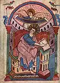 ![]() | Arte carolíngia | - Período de Carlos Magno e seus sucessores. - Arquitectura religiosa com pinturas murais, mosaicos, baixos-relevos (Catedral de Aachen - capela palatina), surge a cripta com deambulatório, mosteiros. - Artes decorativas, marfins, joalharia, iluminura de forte dinamismo de traço, energia ritmica. - Herança céltico-germânica, inspiração na arte romana clássica, espírito medieval, emocional. | |||||||