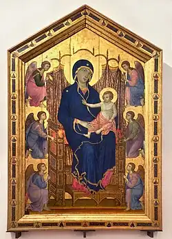 A temática mariana também foi favorecida, influenciada pela tradição das Madonnas ítalo-bizantinas, com predomínio das tipologias da Pietà, da Madonna Graciosa e da Madonna em Majestade. Berlinghiero Berlinghieri, Duccio e Simone Martini foram grandes referências no Gótico Internacional, e Giotto introduziu um novo senso de naturalismo e dramatismo na figura humana e no movimento dos grupos, colocados em cenários simples e eficientes, gerando grande escola. Muitos pintores importantes seriam ativos neste período, como Stefan Lochner, Nicolas Froment, Nuno Gonçalves e uma legião de outros.[31][32]