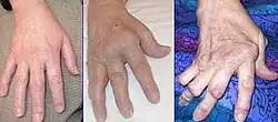 Mão afetada por estádio avançado de artrite reumatoide. Com os atuais tratamentos, geralmente a doença não progride para este grau de deformação