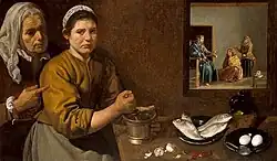 Em 1964, antes da restauração do Cristo na casa de Marta e Maria, numerosos historiadores de arte viam a cena que parece incrustada em cima, à direita do quadro, como se fosse refletida num espelho, ou como se fosse outro quadro pendurado na parede. Este debate continuou, parcialmente, depois da restauração, embora segundo a National Gallery de Londres, que é onde está exposta a tela, Cristo e os seus acompanhantes são visíveis somente através de uma janela que dá a um cômodo contíguo.[40][41] Os vestidos que aparecem em ambos os cômodos são também diferentes; os vestidos da cena principal são contemporâneos a Velázquez, enquanto os da cena onde se encontra Cristo utilizam os convênios iconográficos tradicionais para as cenas bíblicas. N´As fiandeiras, quadro pintado provavelmente um ano depois que As Meninas, aparecem representados duas cenas de Ovídio: num primeiro plano, com vestidos contemporâneos e no plano posterior, com vestidos antigos. Segundo a crítica Sira Dambe, "nesta tela, os aspectos da representação são tratados de maneira similar aos d´As Meninas."[42]