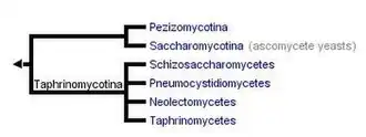 A(s) linhagem(ens) basal(ais) de Ascomycota compreende(m) quatro classes, Neolectomycetes, Pneumocystidomycetes, Schizosaccharomycetes, e Taphrinomycetes, que estão classificados no subfilo Taphrinomycotina. O monofiletismo de Taphrinomycotina é questionável, mas aumentou a amostragem de ambos os táxons e genes, resultando em um maior apoio para o monofiletismo do táxon.[20][21]